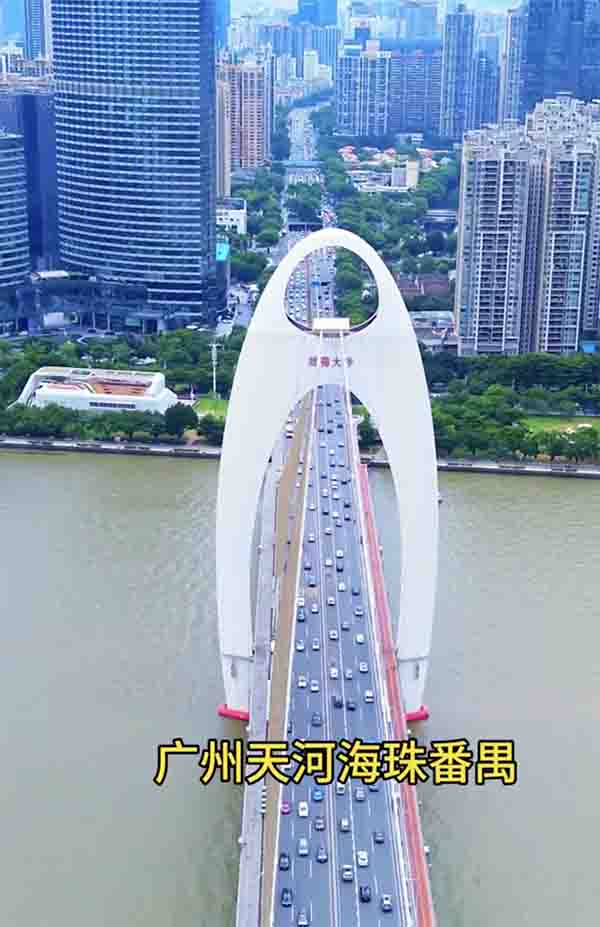 猎德大桥,桥塔如巨型贝壳屹立于珠江上,象征“海上明珠”的母体,传递着广州城与其母亲河珠江源远流长的文化渊源,更寓意着广州人生生不息的开拓精神。
