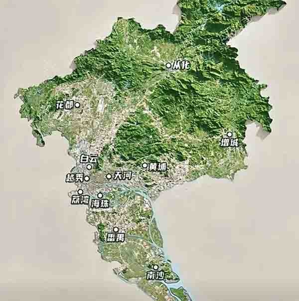 广州地处南岭山脉向平原三角洲的过渡地带,从高空俯瞰,广州自北往南地貌依次为中低山区、山间盆地、丘陵、平原、江湖、海洋,其中北部呈现“两谷镶嵌、三脉入城、四水纵贯”的山水格局,构成广州的生态屏障。