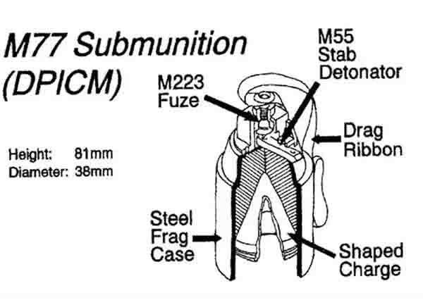 M77子弹药由集束药火炮炮弹M483A1发展而来,是所谓双用途改进型常规弹药。M77通过撞击引爆,爆炸会产生约4米的杀伤半径,其内部的聚能装药可以穿透约60-100毫米厚度的均质钢装甲。