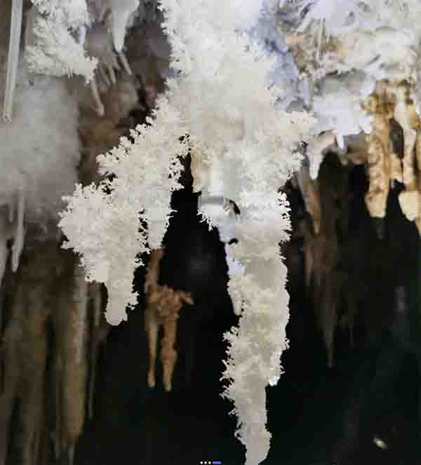 人们发现它迷宫般的多层结构和诸多分岔里,隐藏了一个个铺满石花的支洞,密闭的空间和足够的湿度甚至让岩石面上和狭缝里也沉积出各种石花。在这个石花支洞的末端,有一面白如初雪、薄如蝉翼、仿佛吹弹可破的石旗,厚度仅0.5-4毫米,堪称世界一绝。