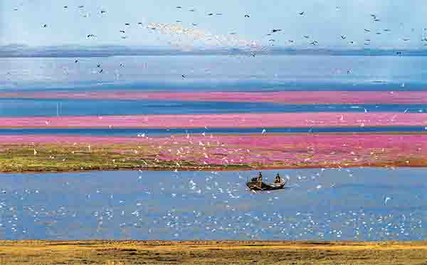 7、8月,长江主汛期来临,汹涌的长江水在湖口形成顶托,甚至倒灌入湖,将湖面推向巅峰。10月,长江水位开始回落,湖水也如大型舞剧的谢幕舞者,有节奏地逐步下降。冬季,湖底出露,化为广袤的泥滩、沙洲和蜿蜒河道。