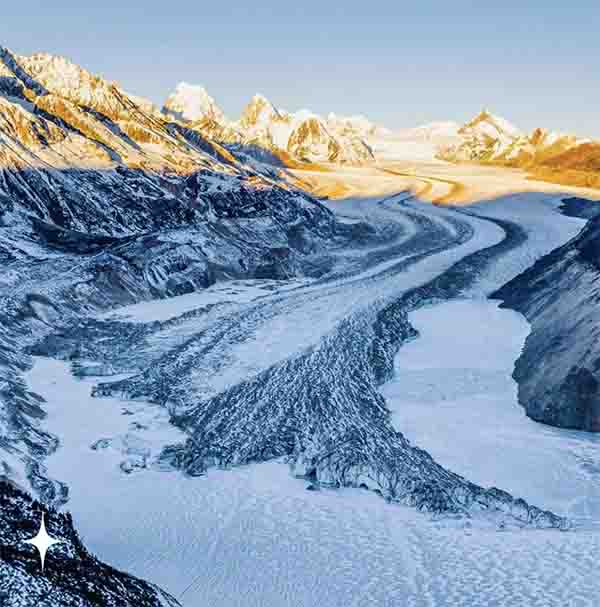 来古冰川的美,与常见的海洋性冰川形成了鲜明对比。海洋性冰川运动速度快,对两侧崖壁的磨蚀和掘蚀作用强烈,导致山谷两侧的岩屑大量坍塌覆盖冰面,往往让冰川看起来像一片巨大的建筑工地。而来古冰川则看起来秩序井然,展现出一种极致的秩序之美与结构之美。