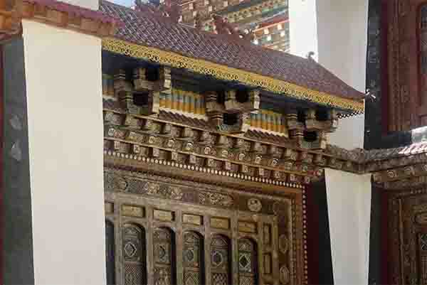 木窗之上便是高大屋檐,这些屋檐也都是用类似于汉族传统建筑的斗拱一层层挑起的,每一层雕刻的图案都不一样。绚烂的金色、红色、绿色、蓝色等色彩涂绘在木构件上,让整栋建筑看上去都极为富丽堂皇。