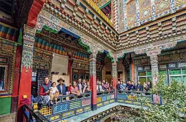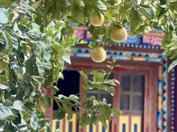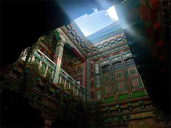 每家的庭院里都种着石榴、柑橘等果木,站在庭院中,举目仰望,面对无比繁复的雕工和彩绘,除了用震撼来形容,仿佛已没有其他词语可代替了。民居内部亦是精美异常,除了客厅和卧室等日常起居场所在一层二层外,民居的最顶层多是供佛的佛堂。