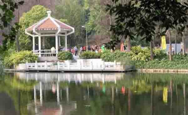 越秀公园东南麓东秀湖畔的观荷亭,造型别致,红色瓦顶在绿树丛中格外醒目 。东秀湖往南的一大片区域就是古时菊湖之所在。宋代首次评选羊城八景,风景秀美的“菊影云影”成为八景之一。宋代亡之后,元军把水库放干,“菊影云影”消失不存。