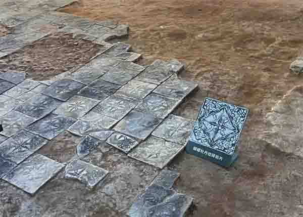 南汉国二号宫殿位于一号宫殿西侧,是一组以多进殿堂、庭院和回廊组合而成的大型建筑院落。庭院中发现了一种精美的铺地砖,砖面中心的菱形方格内印有四只展开双翅的蝴蝶和位于四角的牡丹花,寓意“富贵叠来”。尽管二号宫殿未能被全面揭露,但从其位置、建筑规模,结合文献记载来看,应是皇帝朝政的大殿。