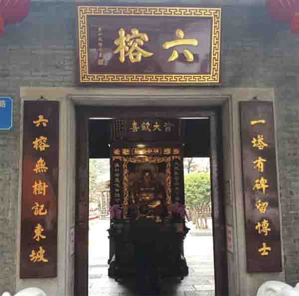 当时广州安抚使程怀立等官吏,久闻苏轼大名,便在净慧寺设宴为他洗尘。苏轼登上千佛塔观光,只见高高的八角形花?独映蓝天,塔畔环植六株根深叶茂的古榕树,苏轼甚是喜爱。道综见状,便请他为寺题额。苏轼欣然提笔,即席手书“六榕”二字,厚重雍容,潇洒遒劲,随后落款“眉山苏轼题并书”。