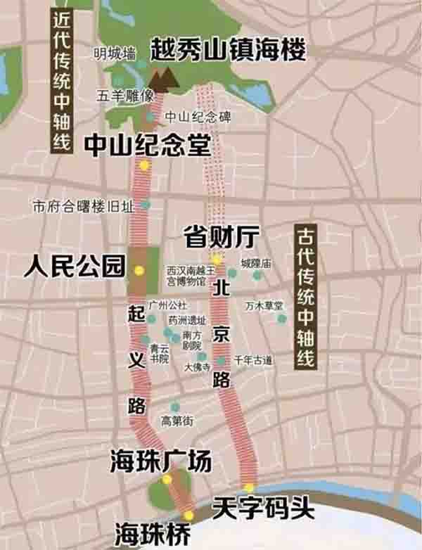 广州城市传统中轴线定义为“从北京路至天字码头的古代城市传统中轴线和从越秀山镇海楼经中山纪念碑、中山纪念堂、人民公园、起义路、海珠广场至海珠桥的近代城市传统中轴线”。