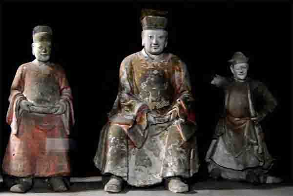 后经挖掘得知,这座庙宇是建于宋代绍兴八年(公元1138年)的显应宫。宫中的神像神态各异,栩栩如生。在这些神像中,前殿西侧神台上的一组泥塑神像引起了考古学家和历史学家的高度关注,因为这组被当地群众称之为“巡海大臣”的神像中,有一座头戴嵌金三山帽,身穿红色簇锦蟒龙袍,腰系玲珑白玉带,脚穿方形?朝靴的神像。