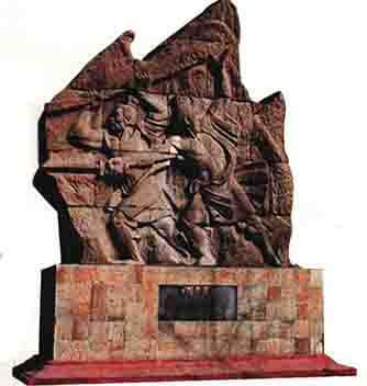 灰陶跪射武士俑: 这件跪射武土俑,头顶挽髻,髻偏右,用红带束扎。面向左侧,双目炯炯有神,注视前方,薄唇紧闭,颈长,肩宽,挺胸,右腿弯曲,膝部着地,左腿蹲曲,右足登地。两手握弓,随时准备射箭。他身穿战袍,披铠甲,腿部有护腿,足穿方口齐头鞋,鞋底还分布着整齐的麻点纹。现藏于秦始皇兵马俑博物馆。