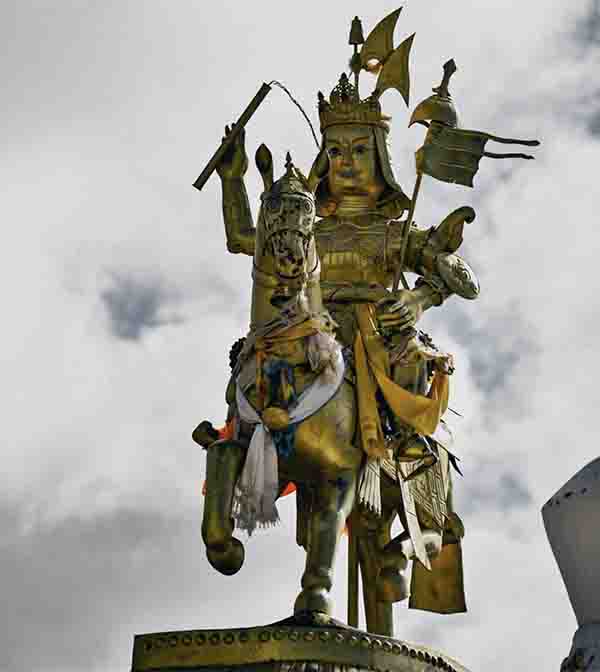 格拉杂山下,尚存传说中格萨尔登基称王的宝座遗址,因为年代悠久,片岩砌成的宝座已与岩石浑然一体,几不可见。山顶建有一座多聪庙,旁边是8座小白塔与长长的嘛呢石墙。白塔前矗立着一座金色的雕像,格萨尔骑在骏马上,左手挥旗,右手扬鞭,再现了当年他称王登基后操练岭国军队的场景。········