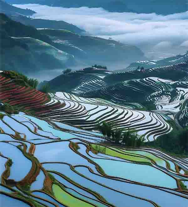哈尼梯田至今已有1300多年历史,规模宏大,遍布于云南南部红河哈尼族彝族自治州元阳、红河、金平、绿春四县,总面积约100万亩,其中元阳县哀牢山是哈尼梯田的核心区。作为云南梯田的代表作,哀牢山哈尼梯田被誉为“中国最美的山岭雕刻”。