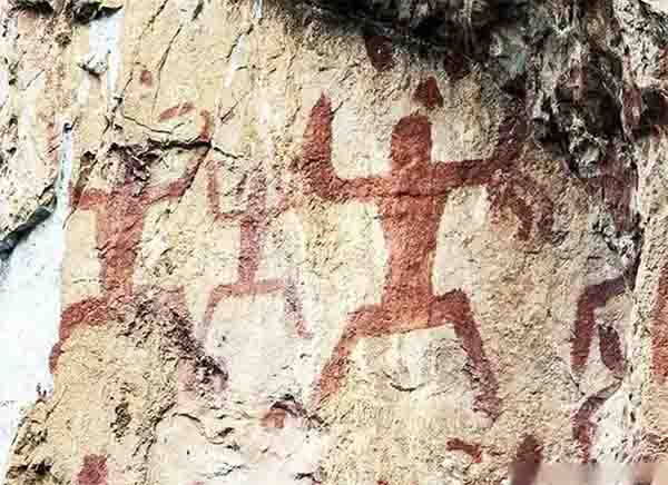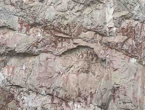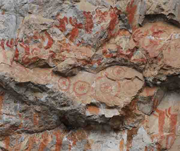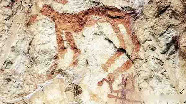 左江花山岩画画面内容丰富,主要由人物、动物和器物组成,其中人物是岩画的主体图像,占全部图像的85%以上,所表达的主题具有原始宗教的意义,是群体性祭祀场景的真实记录。画面多为众多的侧身人像围绕着一个形象高大、装束特殊的正身人像。正身人像的形态与侧身人像有明显区别,脚旁往往都有犬类。