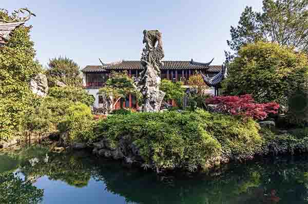 水是园林中必不可少的元素,“无水不成园”的说法早已有之。苏州大小园林中或动或静的池、瀑、泉、涧不仅装饰了一方小天地,也是苏州城水网密集、纵横交错的体现。在中国文化中,“山”和“水”常常是成对出现的意象。在古典园林中,用堆山叠石来模仿自然界的山峦起伏,浓缩天地于方寸中,给人带来宽广的想象空间。