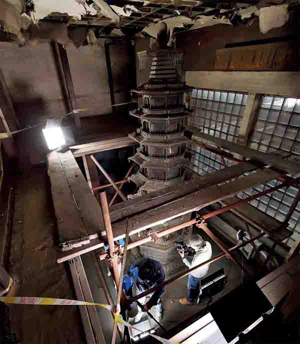 2015年,故宫启动了对养心殿百年来的首次大修,其中包括对养心殿佛堂木塔的修复。这件佛塔体量巨大,高4米,为7层八角紫檀包裹,但存放空间狭窄,仅约20平方米。修复人员先进行逐层熏蒸,消除虫害;再具体通过除尘、脱落部件回粘、加固等手段,自下而上地修复木构件,再整体烫蜡;所有木构件修复完成后,修复其他材质的配件。