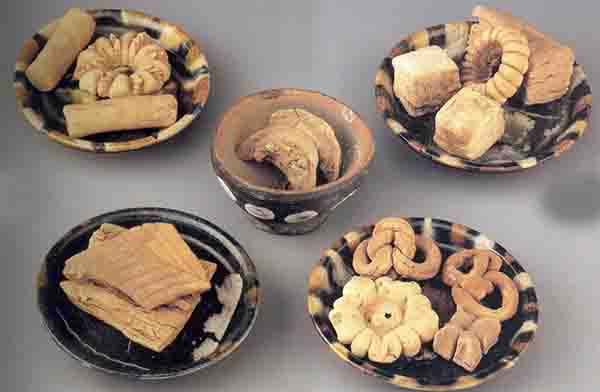 1966年-1972年阿斯塔那墓葬群出土了多种式样的精美面点,如梅花式点心、菊花式点心、四棱式点心,以及叶形面点、筒形面卷等。1972年,在阿斯塔那230号墓出土了宝相花纹月饼,正面压制有萨珊波斯风格的联珠纹图案和印度佛教莲花纹中国化的定相花图案,是目前国内出土的唯一一件月饼式糕点实物。考古人员在墓葬中还发现了唐代的饺子,外皮原料也为小麦粉,形状与今天无异。