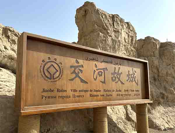 “丝绸之路:长安—天山廊道的路网”共有33处遗址被列入《世界遗产名录》,中国境内有22处,其中6处遗址位于新疆,即高昌故城、交河故城、苏巴什佛寺遗址、克孜尔石窟、北庭故城遗址、克孜尔尕哈烽燧。高昌故城、交河故城都位于吐鲁番。