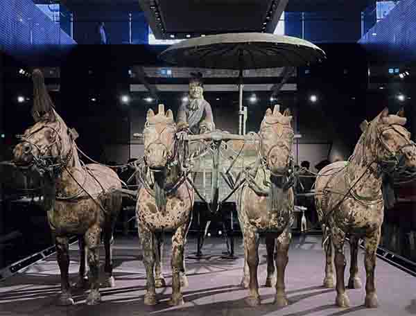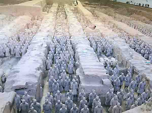 秦始皇陵依咸阳城形制,建造了内、外两道城垣,内外城墙四面都有城门。位于内城南部的秦始皇陵,封土呈覆斗形,至20世纪60年代,尚在封土高76米。经钻探所知,墓葬至少在东、西、北三面有墓道,陵园内发现的陪葬坑、陪葬墓达600多处。此外,陵园内还有已被毁掉的规模宏大的地面建筑群,以及埋藏的大批珍贵文物,其中铜车马和大量兵马俑的出土让世人叹为观止。