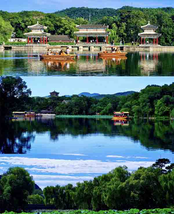 苑景区又分为湖区、平原区和山岳区,湖区洲岛错落,湖面被长堤和洲岛分割成五个湖。各湖之间又有桥想通,两岸绿树成荫,显得曲折有致,秀丽多姿。湖区的风景建筑大多是仿照江南的名胜建造的,如烟雨楼,依照浙江嘉兴南湖的烟雨楼而建。
