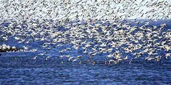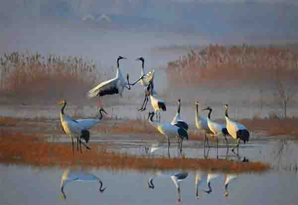 这里是珍禽丹顶鹤等水鸟的重要越冬地和候鸟的重要驿站,丹顶鹤在此越冬的数量多达600只,是我国最大的丹顶鹤越冬地。丹顶鹤是世界濒危鸟类之一,寿命平均60年,最长87年,一年生1-2只小鹤,其野生种群的个体总数在3500只左右。野外仅分布于东北亚地区,即俄罗斯东部、朝鲜半岛中部、蒙古东部、中国和日本。越冬其主要分布在我国山东和江苏盐城,其中又以江苏盐城沿海滩涂的分布数量最多。