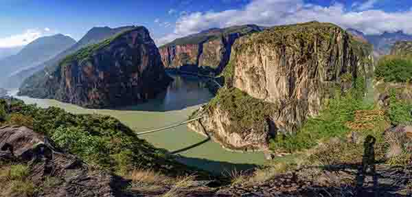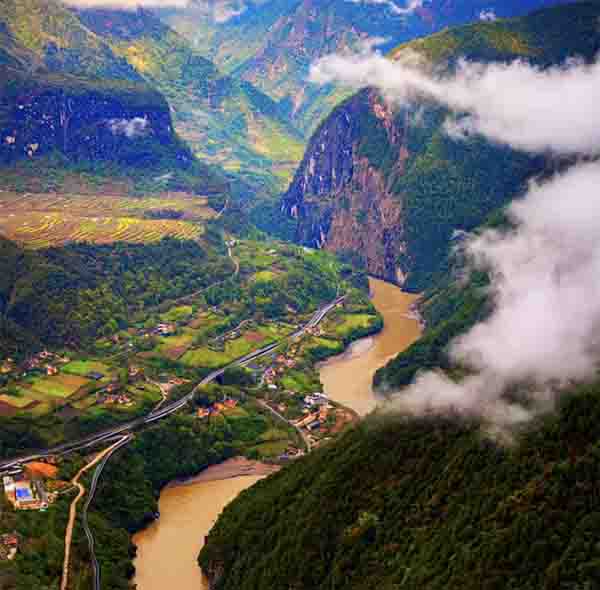 “三江并流”自然形成了“五山夹四江”的大气磅礴的峡谷群景观。五山即自西向东的担当力卡山、高黎贡山、怒山、云岭、大小雪山。“四江”即自东向西的金沙江、澜沧江、怒江、独龙江,它们共同构成了独步世界的“大峡谷群”奇观。