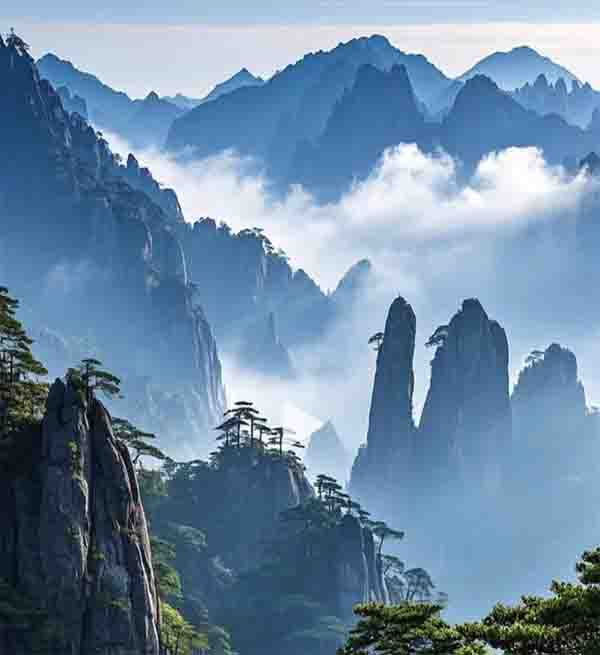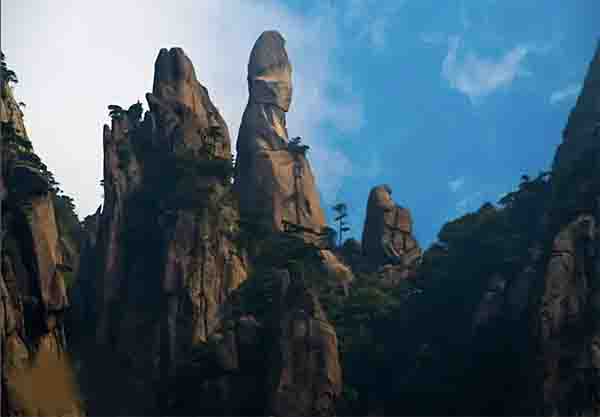 三清山以“绝”惊世。峰峦“秀中藏秀、奇中出奇”,是“云雾的家乡,松石的画廊”。奇峰怪石、古建石雕、虬松丽鹃、旭日晚霞、响云荡雾、神光蜃景、珠冰银雪异美无比,“司春女神”“巨蟒出山”“观音赏曲”惟妙惟肖。除三清列坐外,最象形的山峰还有南天门的“观音听琵琶”。这一组象形奇峰位于三清山梯云岭景区,海拔1600米,由三座山峰叠合成一幅美妙绝伦的画面。
