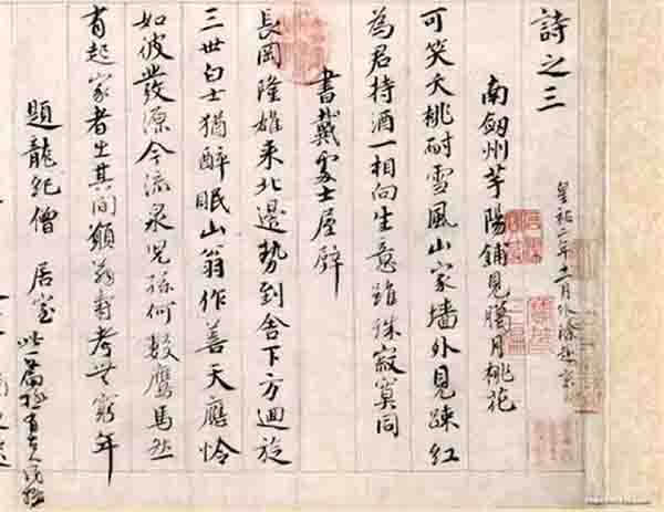 诗卷有历代题跋,最珍贵者为欧阳修及杨时的字。在第三首诗《题龙纪僧居室》题目之下,有欧阳修手书“此一篇极有古人风格”的赞语。蔡襄与欧阳修并称“欧蔡”,同时出现在一幅作品之中,可谓珍贵无匹。