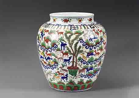 现藏台北故宫博物院。该件瓷器的主纹于岩石、草丛、林木、云朵之间,满绘五彩群鹿89头