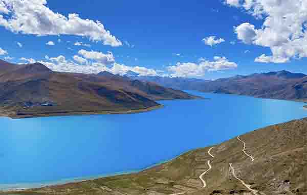 大名鼎鼎的羊卓雍错,可能是西藏最易接近的大型湖泊,从拉萨到日喀则的公路便经过这座圣湖。它不像其他大湖那般一望无际,湖岸线错综复杂,如同珊瑚的枝杈围绕着山体延展。羊卓雍错和当惹雍错一样,是“神山圣湖”的模式典范,湖畔矗立着宁金抗沙峰等雪山,湖中散落着小岛。