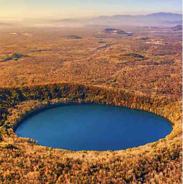 吉林省白山市靖宇县境内的四海龙湾便是典型的玛珥湖,湖面浑圆,如同一轮满月,抑或一面天神遗落人间的镜子。每逢秋季,四海龙湾四周层林尽染,湖水倒映着色彩斑斓的森林。