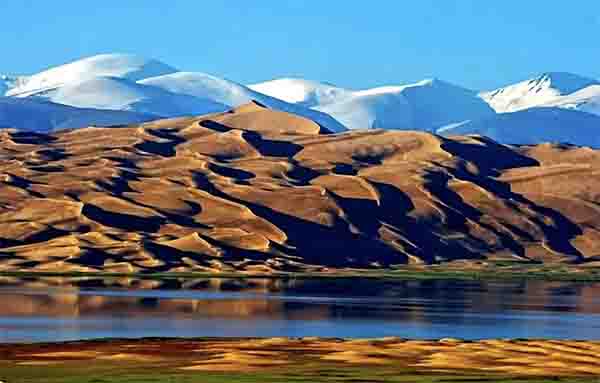 有一个沙漠,它的典型景观是这样的:连绵起伏的金色沙丘层层叠叠,如凝固的波涛向天际奔涌。在它的南方不远处,一座高大的雪山—昆仑山,其终年积雪在蓝天下泛着冷冽的光,犹如悬在沙海之上的琉璃宫殿。