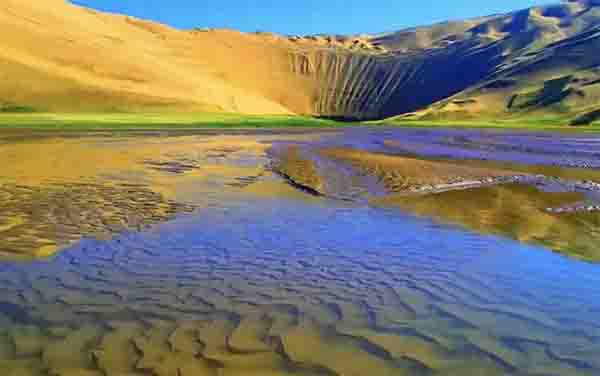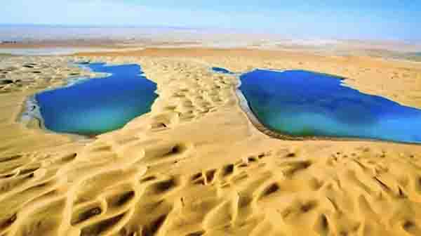 在沙丘附近,分布有星星点点的蓝色湖泊。这些湖泊,不仅有面积广阔的盐湖,也有面积不大但对野生动物意义重大的淡水湖或泉眼。夏季时,这些碧蓝清澈的小湖旁边,点缀着绿意盎然的湿地草甸。数量众多的野牦牛等野生动物,奔跑于沙丘、湖泊、草甸之间。冬季时,大地开始归于沉寂,湖泊封冻结冰,白如银月。