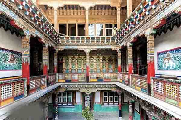 每家的庭院里都种着石榴、柑橘等果木,站在庭院中,举目仰望,面对无比繁复的雕工和彩绘,除了用震撼来形容,仿佛已没有其他词语可代替了。民居内部亦是精美异常,除了客厅和卧室等日常起居场所在一层二层外,民居的最顶层多是供佛的佛堂。
