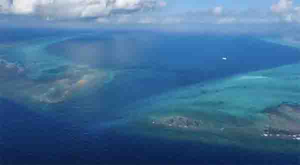 从高空俯瞰,黄岩岛的轮廓如同一个等腰三角形,巨大的环礁如张开的臂膀,拥着一汪?湖。从礁岸向湖心,海水的颜色由透亮的青绿,渐变为沉静的深蓝。在环礁的东南部,有一处连通?湖与外海的通道。