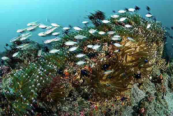 黄岩岛活造礁石珊瑚的平均覆盖度为28.6%,在未来规划为保护区的东北部礁坡,活珊瑚覆盖比例高达37.1%,足以与世界上著名的澳大利亚大堡礁相媲美。水下,鹿角珊瑚如森林中的大树般舒展着枝丫,鱼群在其间穿梭游弋。