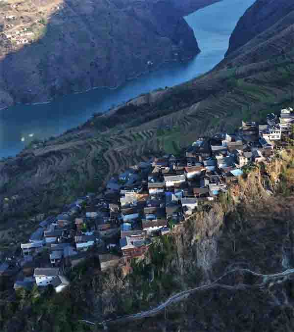 一块巨石在金沙江峡谷中凸出来,在巨石上则是呈梯级分布的一排排民居,这就是云南丽江玉龙纳西族自治县宝山乡的石头城村。民居沿着石头的高度错落分布,由村子最高处的一排房子到最低处的一排房子,落差达到了500米。